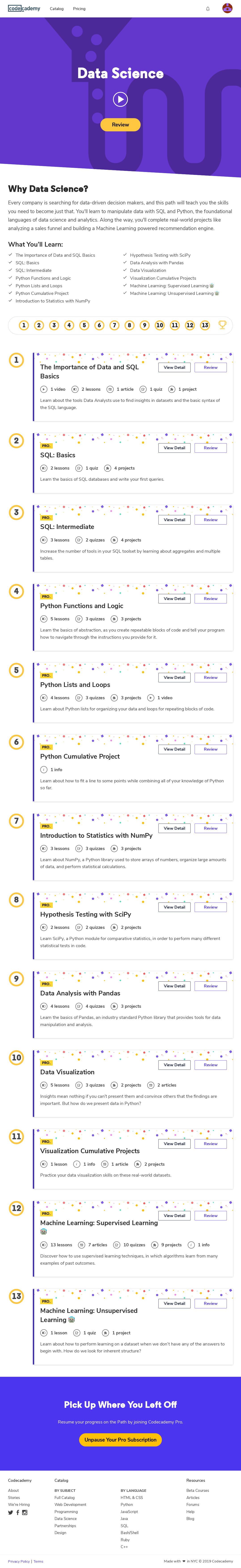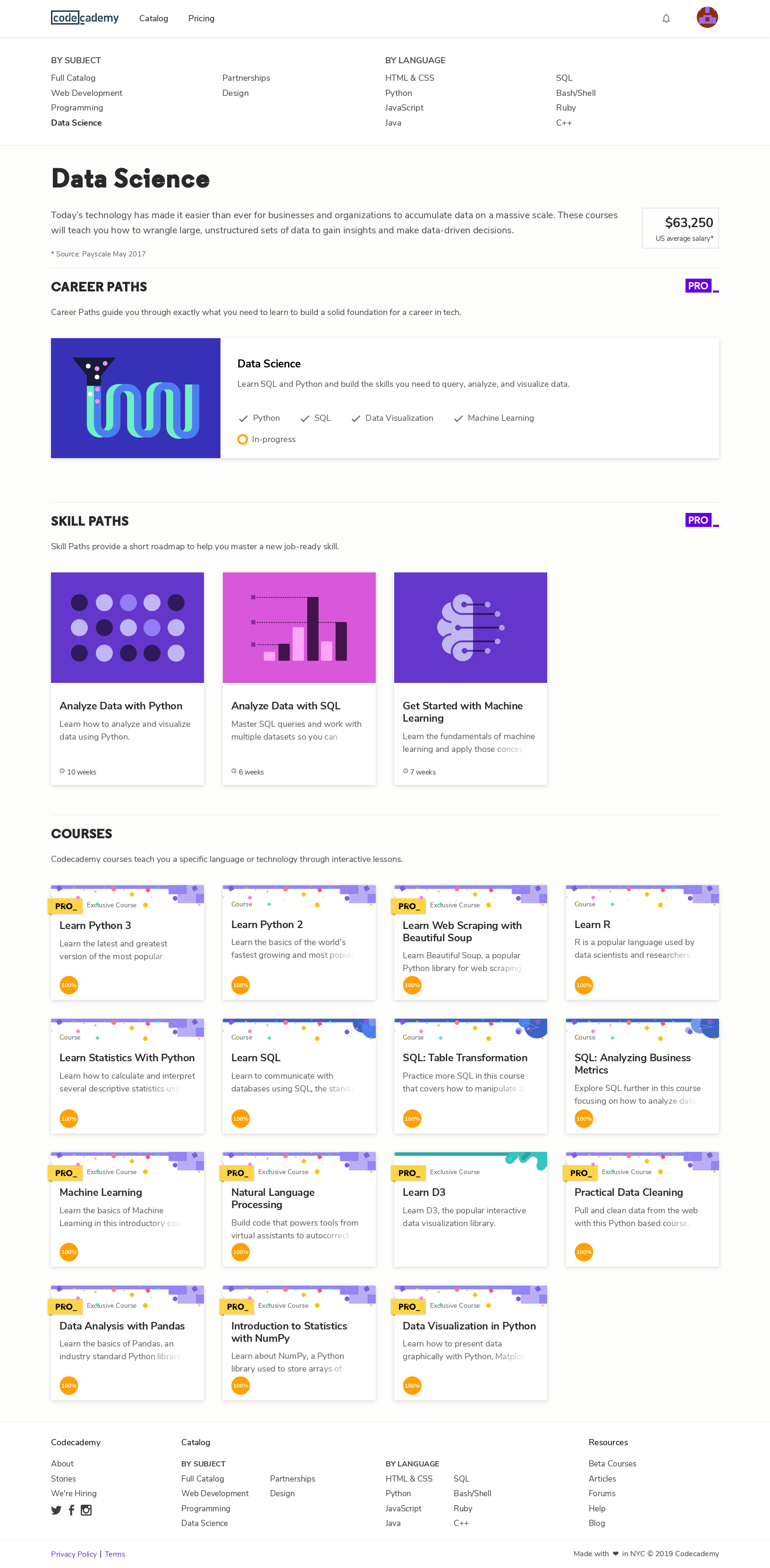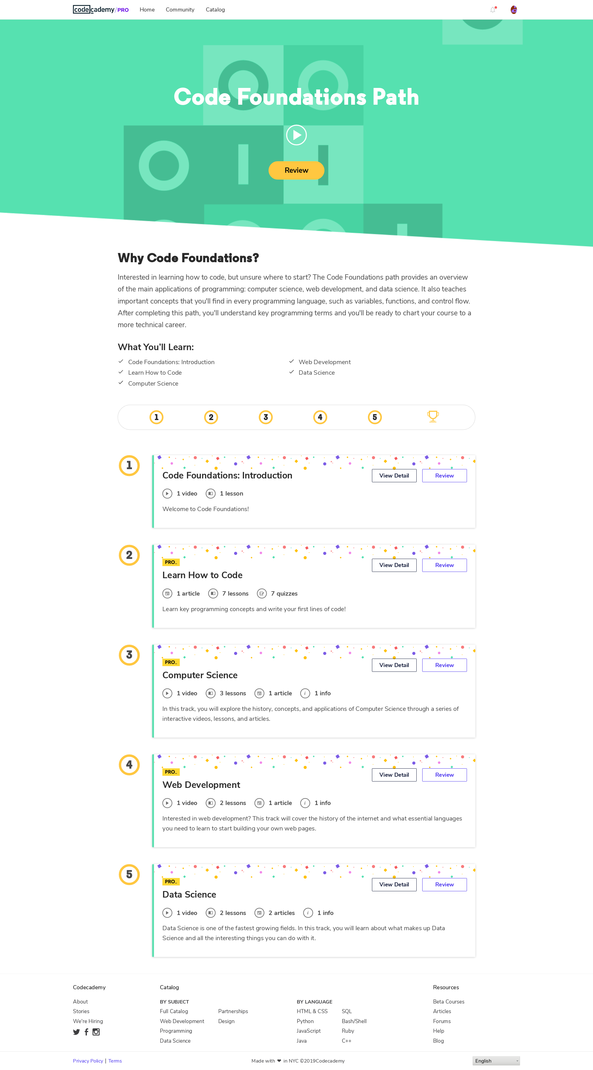 (Note: Currently shows some uncompleted courses as well. Screenshots are unedited, and since taking these screenshots I've completed the Introduction to JavaScript, Learn CSS, and D3 courses)